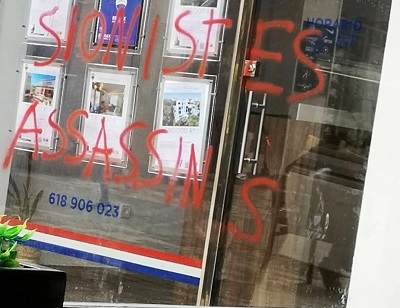 ![]() | Una pintada de todo el cristal del escaparate dice “Sionistes Assassins”, en otras se insulta a los judios y en una de grandes dimensiones reza “Jude” y una gran estrella. Ha llegado una carta a nuestra redacción |